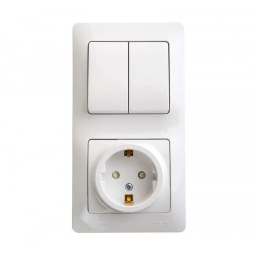 GLOSSA Блок: розетка с заземлением со шторками+выключатель двухклавишный белый